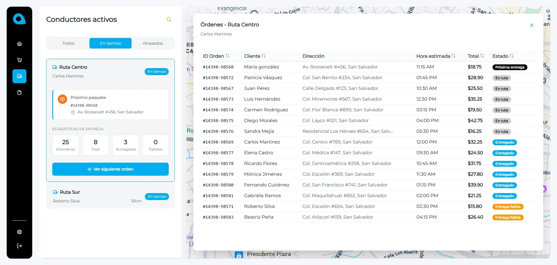 Cada conductor podrá ver el detalle de la orden a entregar, productos, ubicación, tiempo de llegada o cualquier otra información que se coloque dentro de la orden asignada.